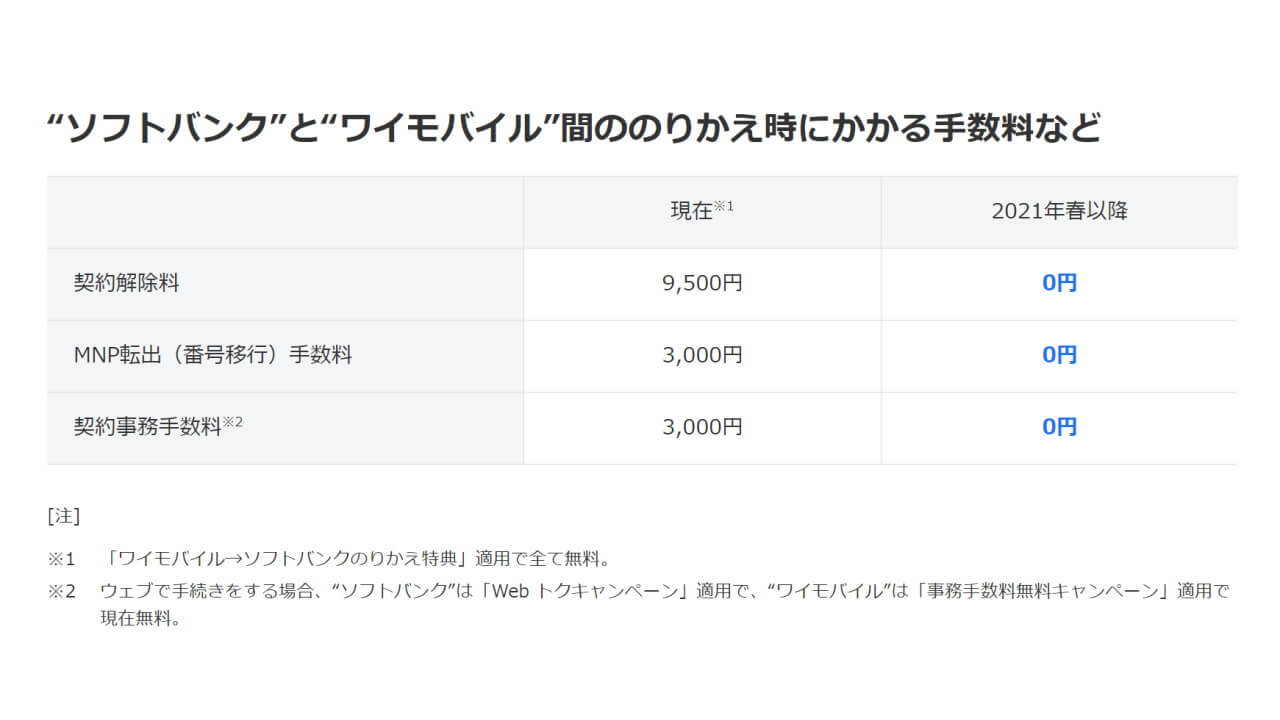 ソフトバンクは 2020 年 12 月 9 日、ソフトバンクとワイモバイル間のマルチナンバーポータビリティー(MNP)移行時に発生する MNP 転出手数料、事務手数料、契約解除料を、2021 年春を目処に無料化すると発表ていましたが、2020 年 12 月 21 日に改めて、当初は例外として手数料が発生するとしていた店頭手続き(税抜き 3,000 円)についても無料化すると発表しました。
