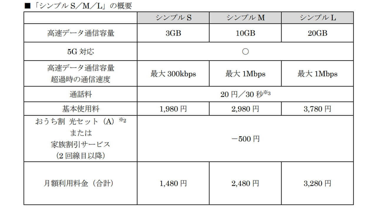 「シンプル 20」は提供されず、2021 年 2 月より新たに、月 3GB の「シンプル S」、月 10GB の「シンプル M」、月 20GB の「シンプル L」が提供開始されます。基本料金は、「シンプル S」が月額 1,980 円(税抜き)、「シンプル M」が月額 2,980 円(税抜き)、「シンプル M」が月額 3,780 円(税抜き)で、次世代通信規格「5G」もそのまま利用可能です。