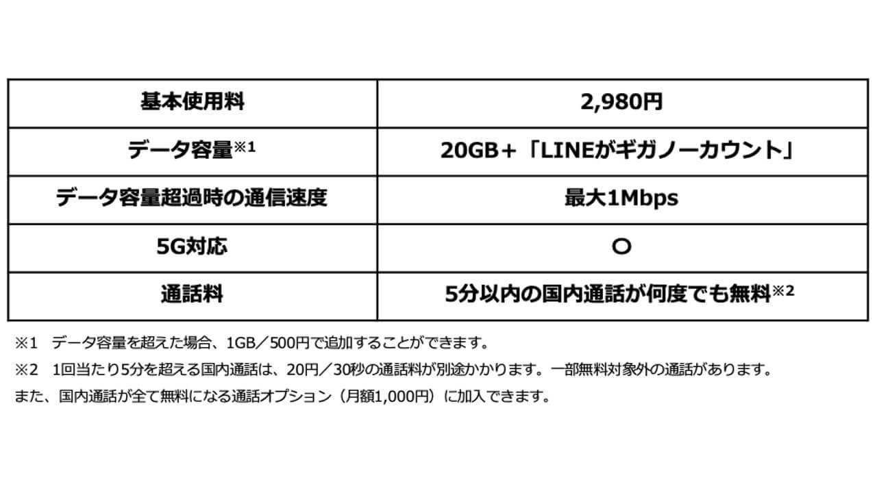 その内容は「ahamo」と同じく、データ容量 20GB + 5 分通話定額付き + 次世代通信規格「5G」対応で、さらに「LINE」のデータ容量がカウントされない「LINE がギガノーカウント」も付き、月額料金「ahamo」と同じく月額 2,980 円(税抜き)。そして、契約はオンライン限定で、「LINE」アプリ上で様々な手続きを行うことも可能です。