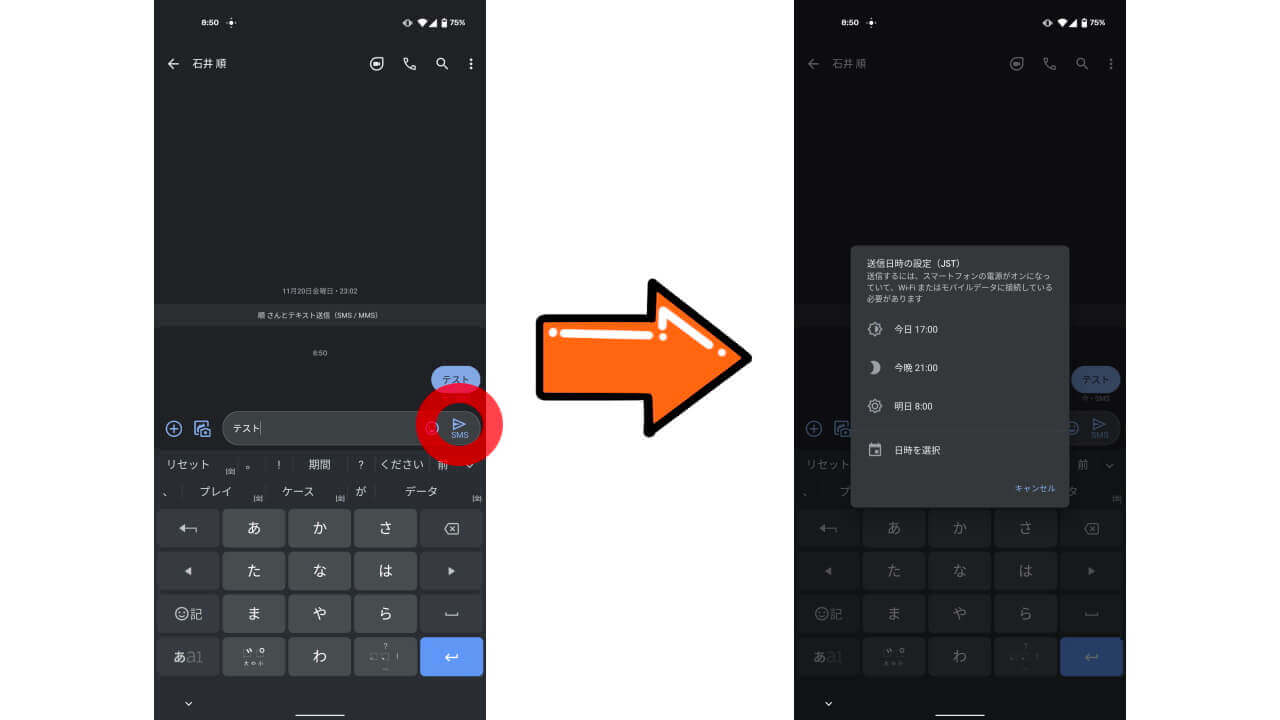 Android「メッセージ」アプリのスケジュール送信機能を実際に利用する方法は簡単で、メッセージ送信時の[➤(送信)]ボタンを長押しして、ポップアップ表示される[送信日時の設定]ウィンドウから任意の日時を指定して送信予約を行います。