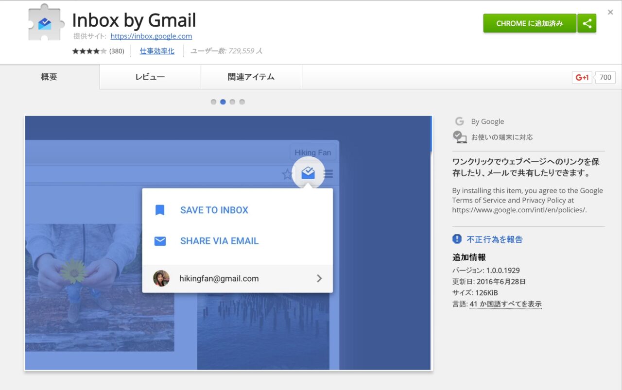 2 つ目の Chrome ウェブストアから拡張機能を追加してショートカットアイコンから保存する方法は、まず、Chrome ウェブストアから拡張機能「Inbox by Gmail」を Chrome ブラウザに追加します。