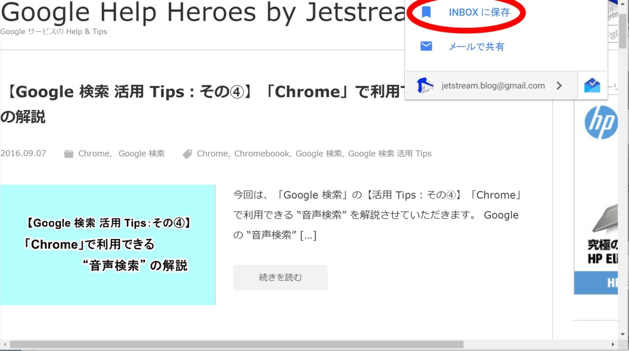 保存するウェブサイトを開いている状態で、右上に追加された「Inbox by Gmail」のショートカットアイコンをクリックし、“Inbox に保存” をクリックします。