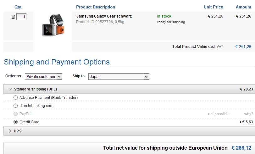 すでに一部の国・ショップで発売が開始されているGalaxy Gear、ドイツの小売店でBLACK・WHITE・GRAY・ORANGEの4色が入荷しておりました。