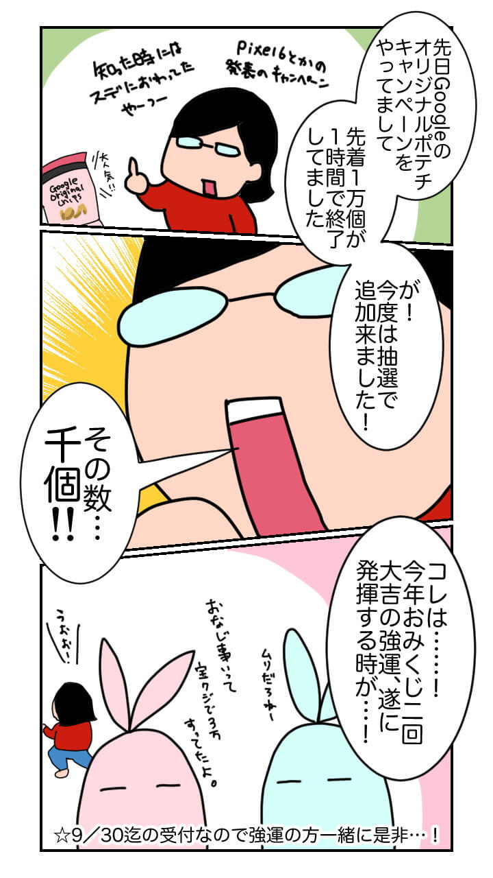 当初開始された「Google Original Chips キャンペーン」は、先着 10,000 名にオリジナルチップスをプレゼントするというもの。そして追加で開始されたキャンペーンは、2021 年 9 月 30 日までの応募受付で、その中から抽選で 1,000 名にオリジナルチップスをプレゼントするというものです。