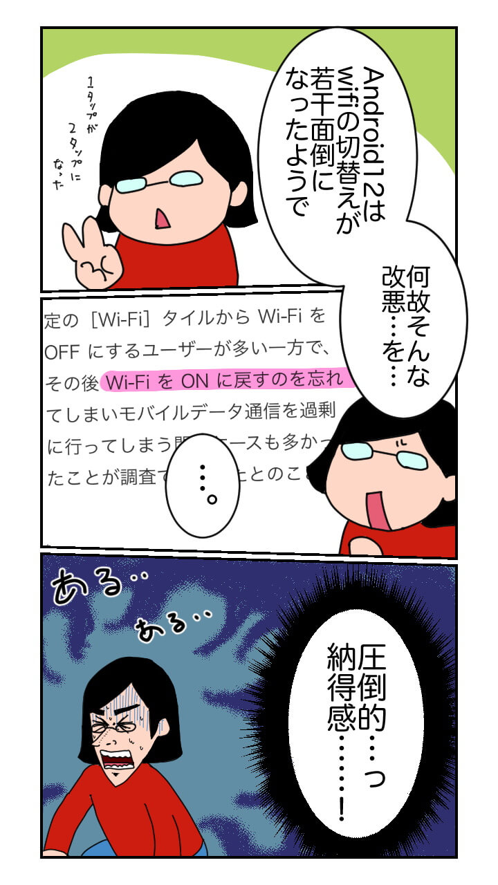 「Android 12」にて Wi-Fi の ON / OFF がしにくくなった理由は、Wi-Fi を OFF にした後に ON に戻すことを忘れてモバイルデータ通信を過剰に行ってしまうユーザーが多かったためです。そのため「Android 12」では、クイックパネルにおける[モバイルデータ]と[Wi-Fi]を[インターネット]に統合して[モバイルデータ]と[Wi-Fi]の各 ON / OFF 状況を把握しやすくしつつ、Wi-Fi の ON / OFF に 1 工程必須としたとのこと。