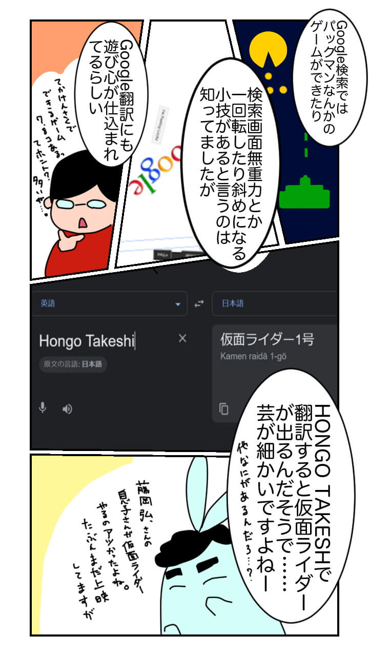 Google は 2022 年 1 月 16 日の「ヒーローの日」にちなんで、「Hongo Takeshi(もしくは Takeshi Hongo)」を「Google 翻訳」で英語から日本語に翻訳すると、なんと「仮面ライダー 1 号」として結果が返ってくるという、面白いネタを紹介する SNS 投稿を行いました。