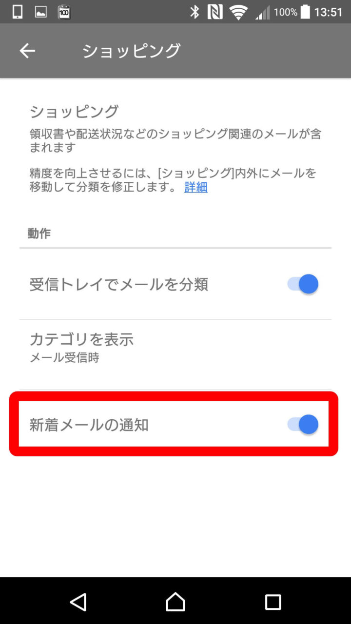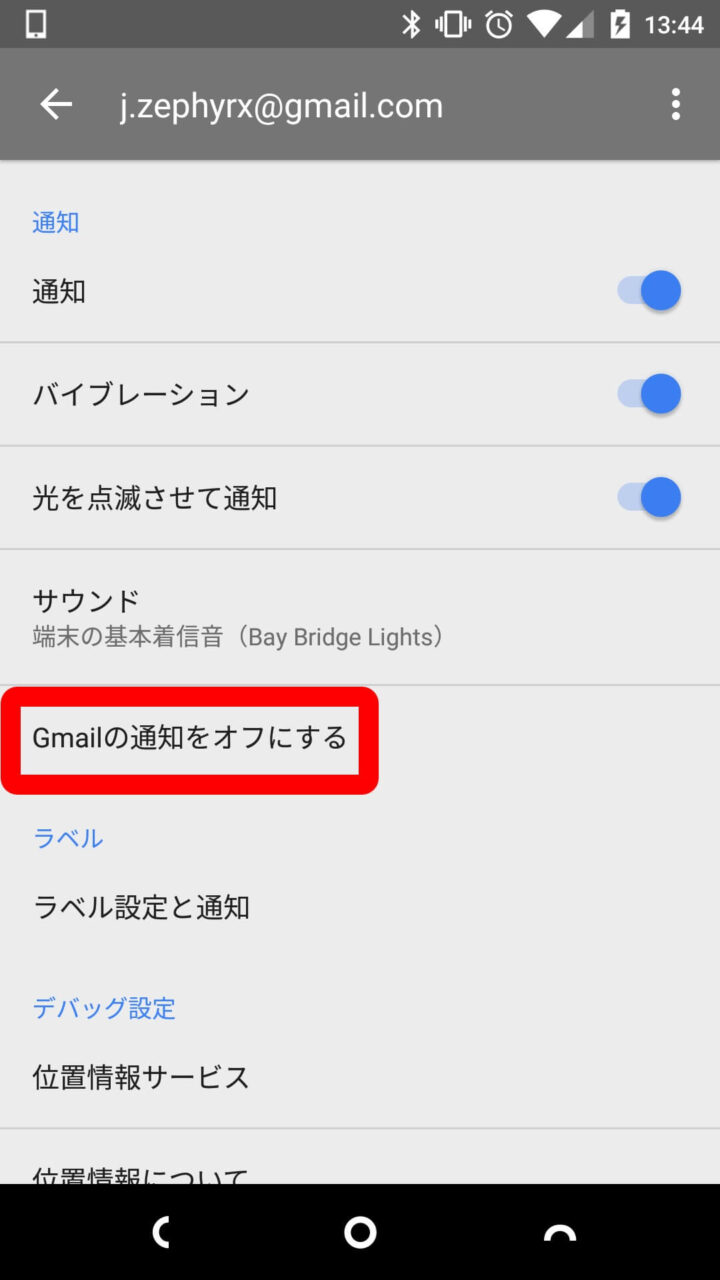 ただし、「Gmail」の通知を OFF にする設定は同期されないので、機種ごとに設定する必要があります。