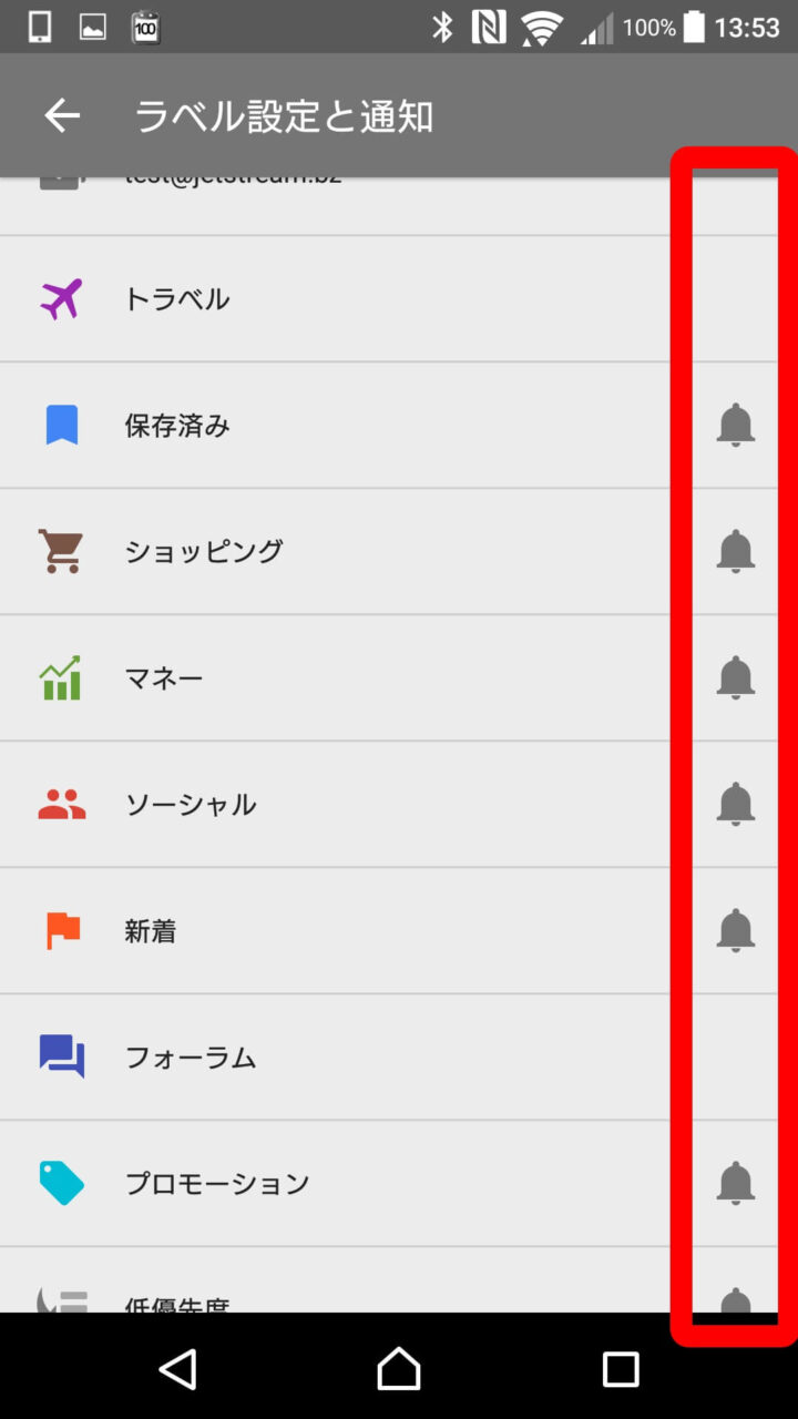 そのためそれらのラベルの新着メールを通知させる場合、設定からラベルごとに通知を ON にする必要があります。
