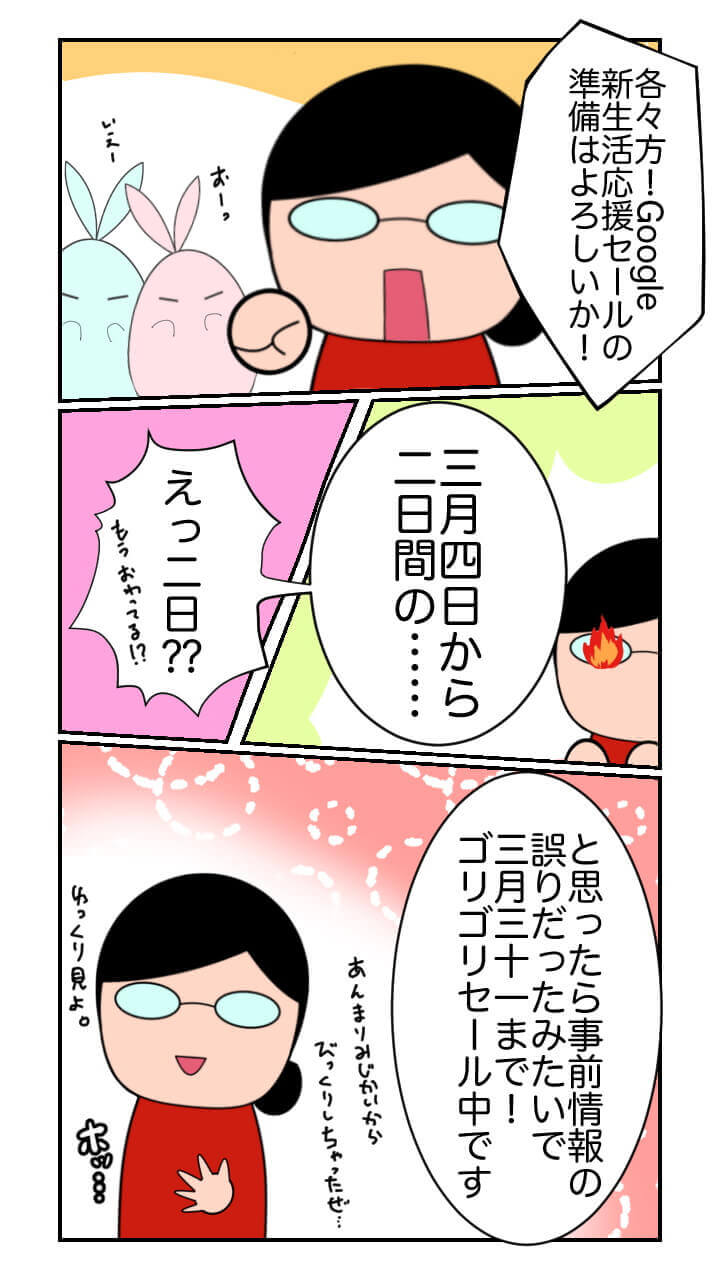 Google ストアの 2022 年版「新生活応援キャンペーン」は当初、2022 年 3 月 5 日までの二日間限定開催と事前に発表されていたのですが、どうやらその情報は誤りで、実際には 2022 年 3 月 31 日(木)までの長期間開催となります。つまり現在セール真っ最中!