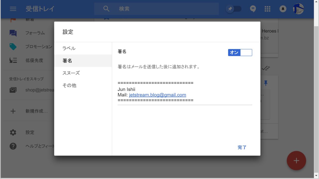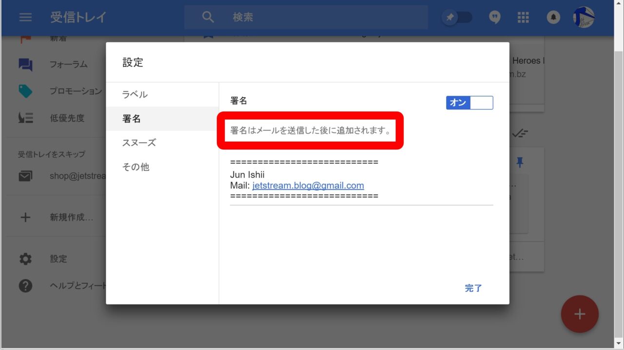 つまり「Inbox」では「Gmail」に登録している Gmail アドレス以外のメールアカウントの署名を設定することはできないということです。