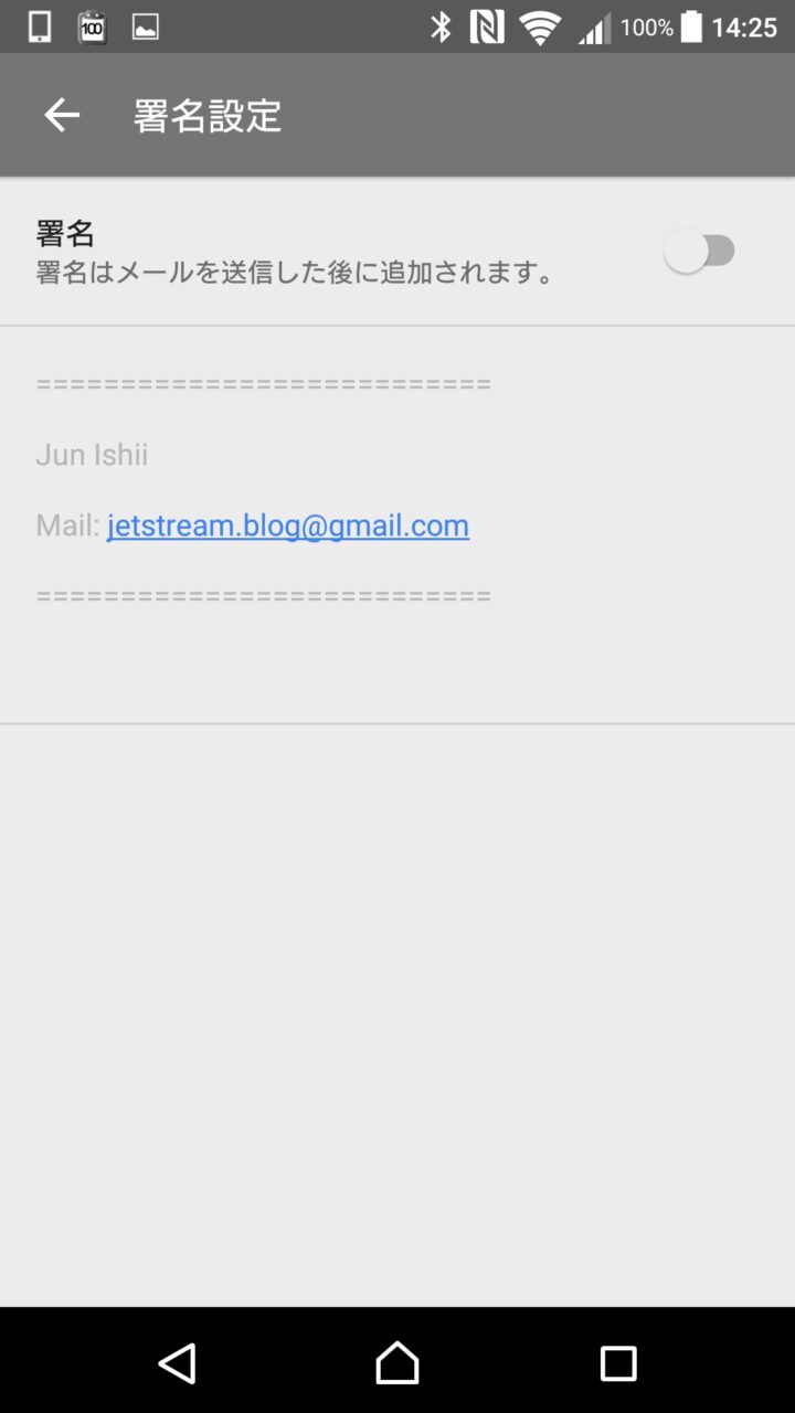 ただウェブブラウザ版「Inbox」で署名をオンにしていても、スマートフォンアプリ側ではオンにはならず、機種ごとに オン / オフ の設定を行えるようになっています。