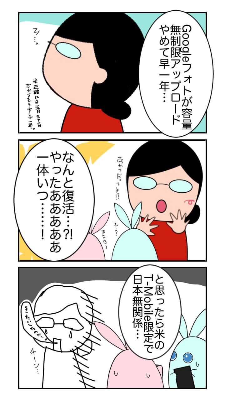 ただし、米国キャリア T-Mobile ユーザー限定。しかも、T-Mobile 経由で Google 有料クラウドストレージサービス「Google One」の T-Mobile 限定新プラン「2TB + Unlimited Google Photos」を契約する必要があります。残念ながら、日本は関係なし。