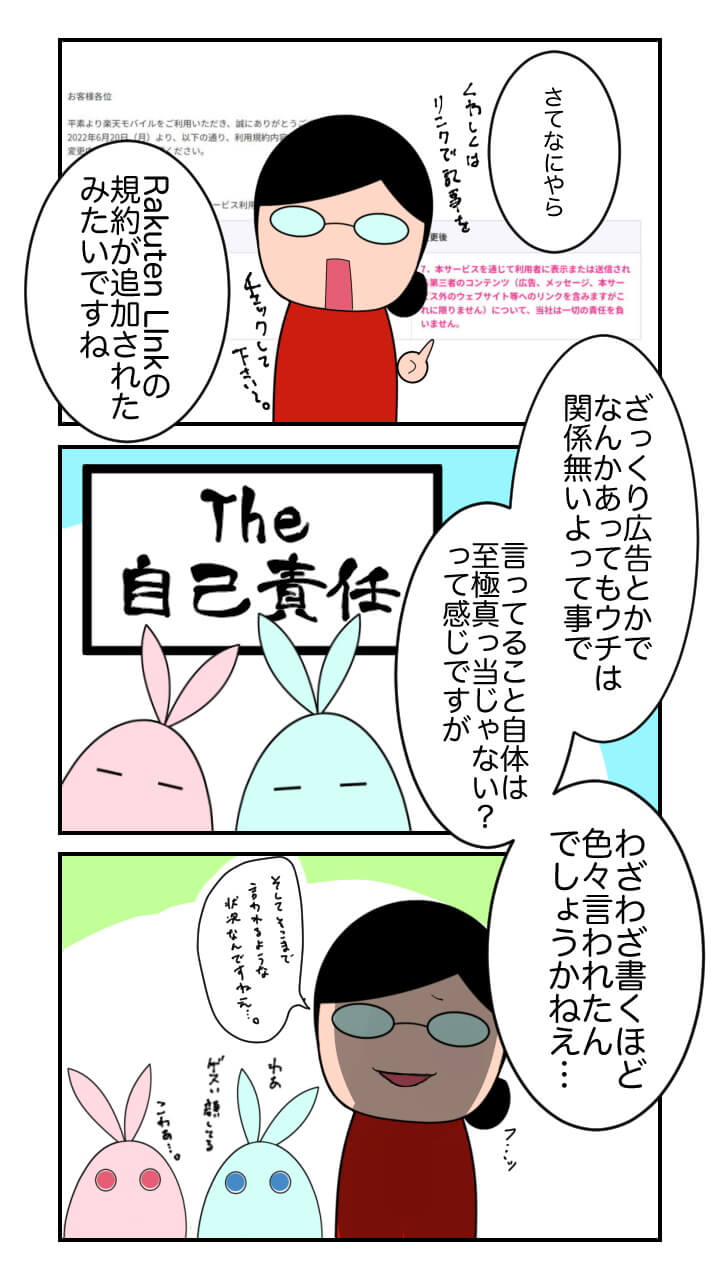 今回適用開始された「Rakuten Link」規約変更箇所は第 13 条[責任]部分で、これまでの第 1 項 ~ 第 6 項に加えて新たに第 7 項が追加されるというものです。新たに追加される第 7 項の実際の内容は、「Rakuten Link」上で表示された第三者コンテンツやユーザーが「Rakuten Link」を通して送受信した第三者コンテンツについて、「楽天モバイル」が責任を負わないという、責任回避的な内容となっています。