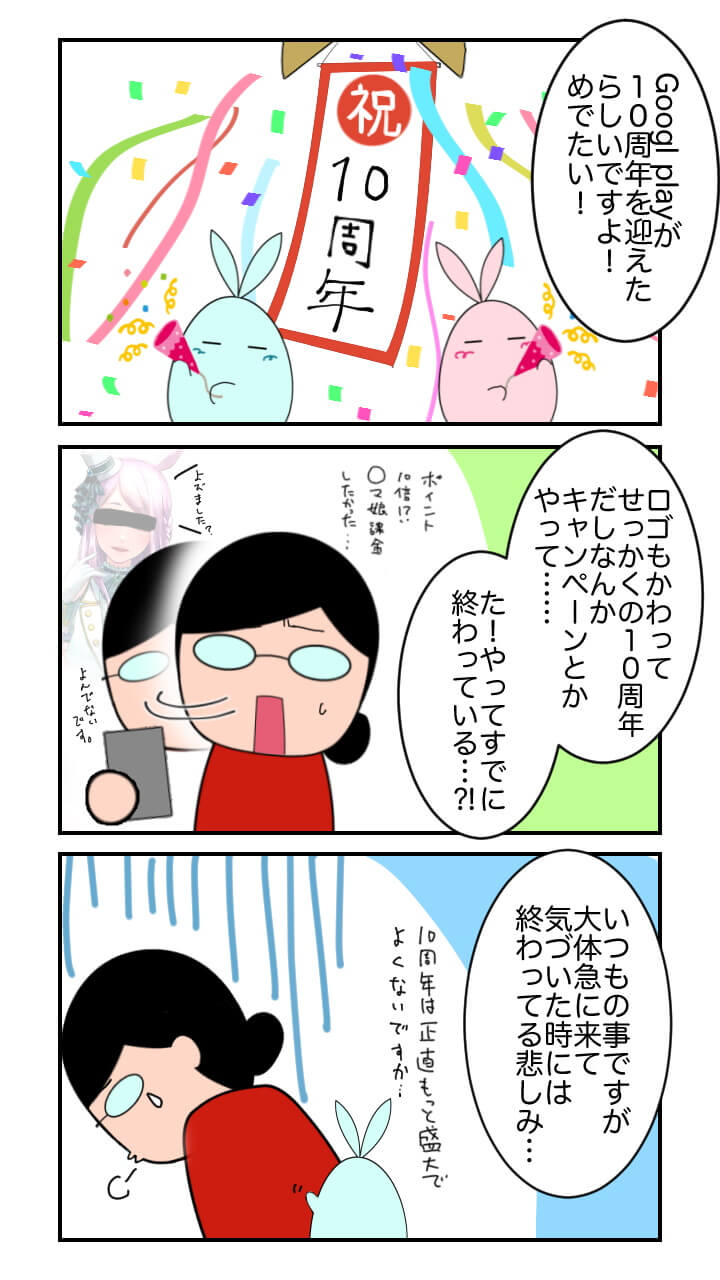 「Google Play」10 周年ということで盛大にキャンペーンが行われるとおもいきや、「Google Play Points」獲得ポイントが 10 倍になる「Play ポイント 10 倍」キャンペーンがたった二日間行われたのみ。10 周年なんだし、もうちょい盛大に行ってほしかたですねー^^;