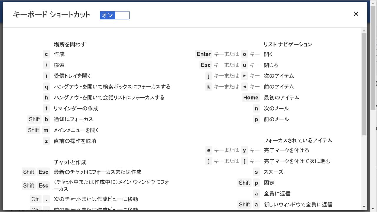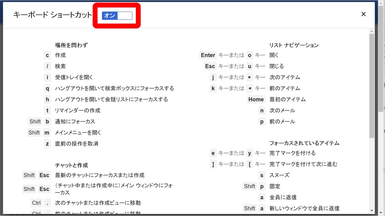 これでキーボードショートカット一覧が表示されるのですが、上部のスイッチが オフ になっている状態では、基本的にキーボードショートカットを利用することはできません。