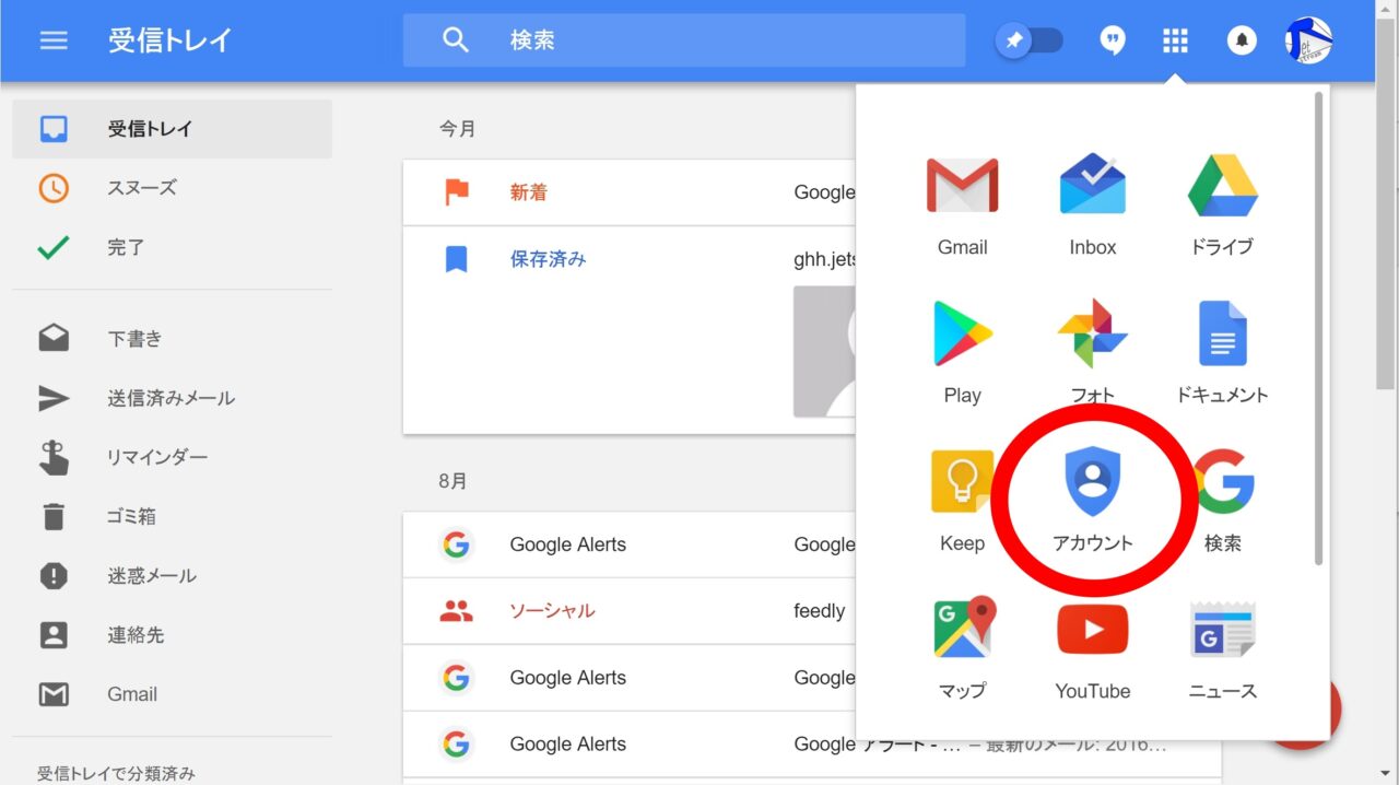 Google アカウントに接続済みのアプリや WEB サイトの確認は、まず Google のアカウント情報が集約された「アカウント」を開き、“接続済みのアプリとサイト” をクリックします。