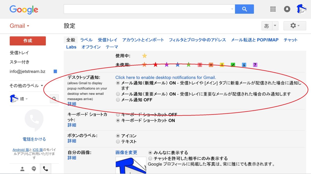 設定方法は、「Gmail」ページ右上の歯車マークから設定を開き、全般タブの中にある “デスクトップ通知” で通知を “ON” にします。