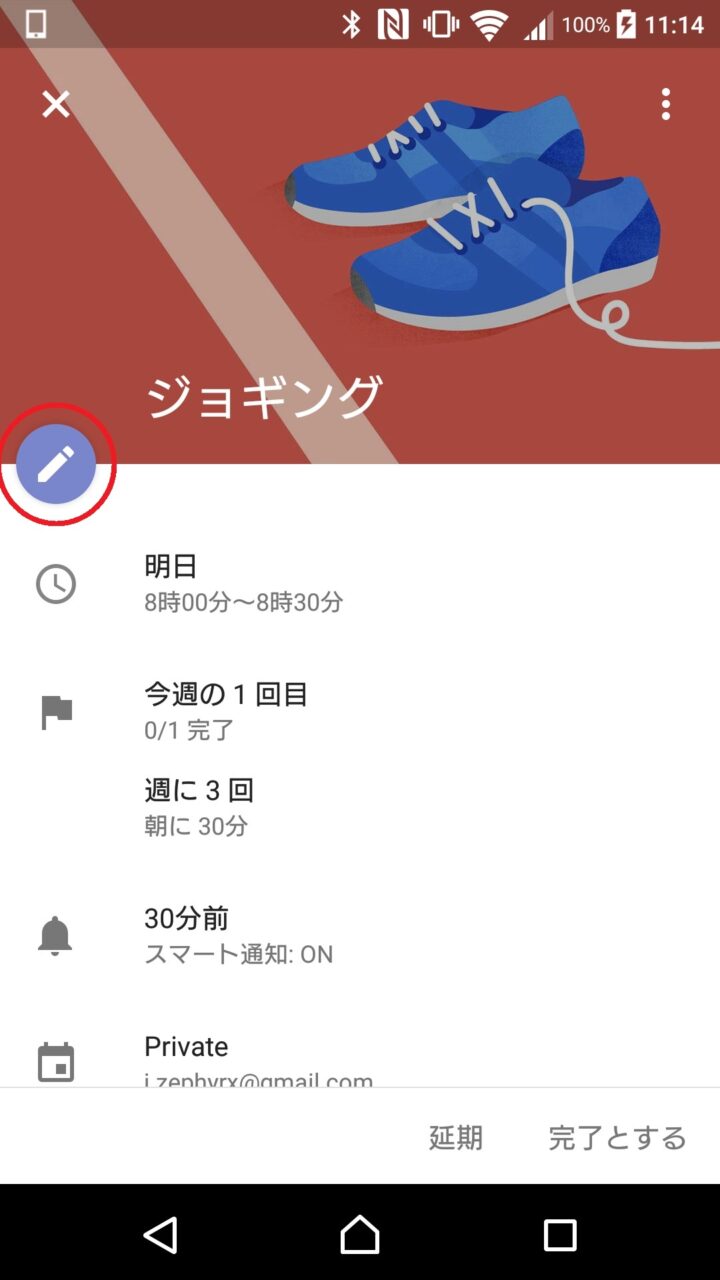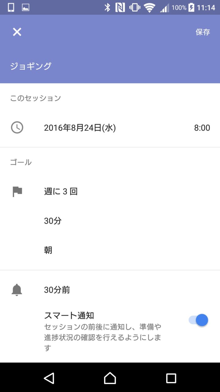 表示された編集画面では、アクティビティの名称の変更、日時の変更、アクティビティの頻度や時間、時間帯の変更、スマート通知の設定、「Google カレンダー」に表示する際の既定色の変更、スケジュールの公開設定を行うことができます。