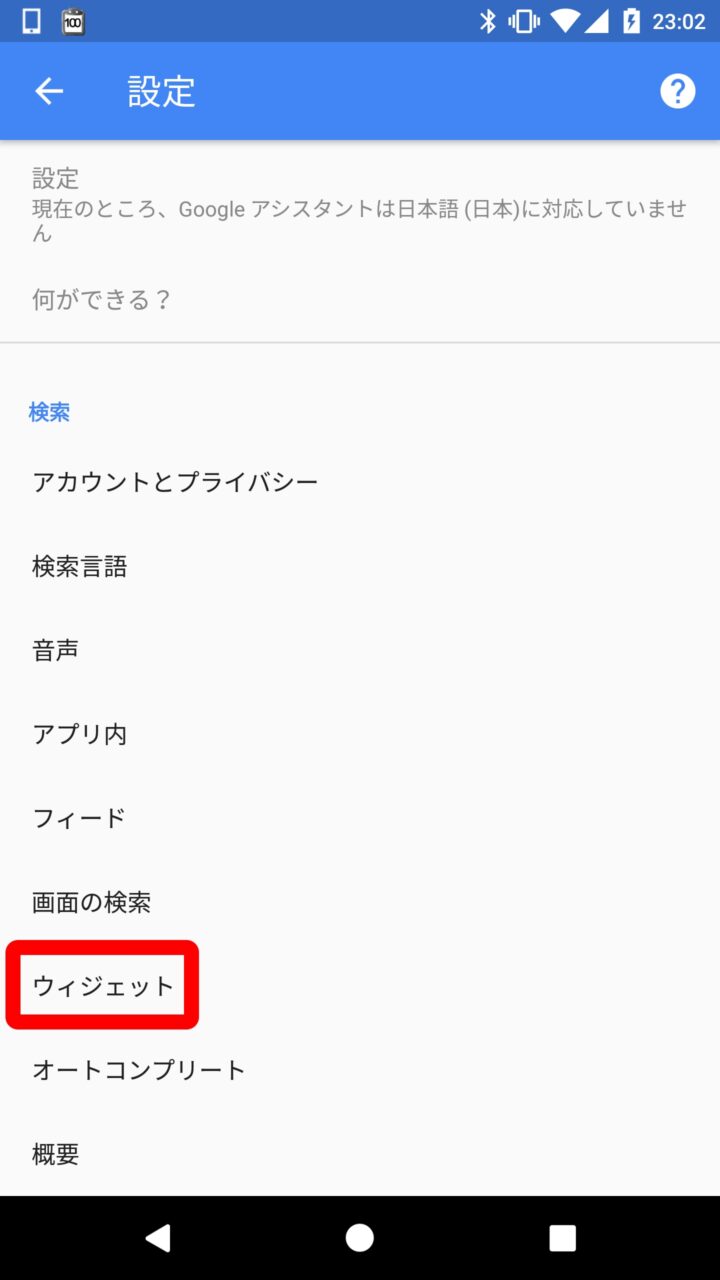 最新の Android 版「Google アプリ」の設定には “ウィジェット” という項目があります。この “ウィジェット” はホーム画面に Google 検索の “検索バー ウィジェット” を配置している場合に表示される項目で、“検索バー ウィジェット” を配置していない場合は表示されません。