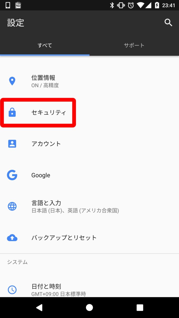 Android のロック画面に任意のメッセージを表示させる設定は Android のセキュリティ設定から行います。まずは Android の設定を開き、“セキュリティ” をタッチします。