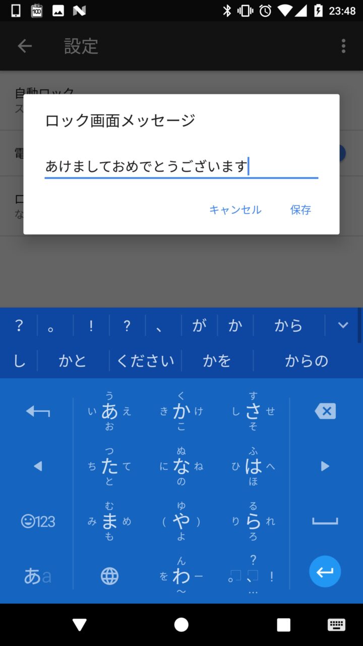 “ロック画面のメッセージ” をタッチするとメッセージ入力用のウィンドウが表示されるので、そこにメッセージを入力し “保存” をタッチします。これで完了です。