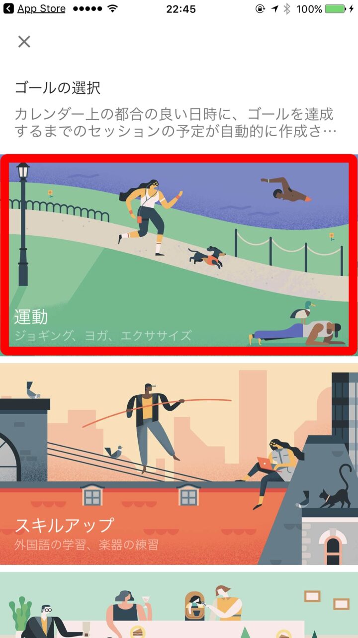 iOS 版「Google カレンダー」アプリと Apple ヘルスケア アプリの連携方法は、“ゴール” におけるフィットネススケジュールの作成時に簡単に行うことができます。まず「Google カレンダー」アプリを起動して右下の “+” アイコンから “ゴール” をタッチし、“運動” セクションからフィットネススケジュールを作成していきます。