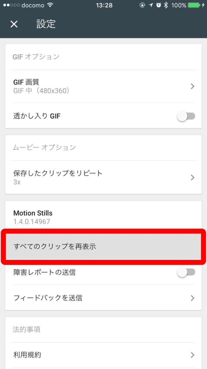 ただし注意点として、「Motion Stills」に表示されるクリップを全て非表示にしてしまった場合は設定すら開けなくなってしまいます。その場合は何かしらのライブフォト撮影を行ってクリップを一覧画面に表示させることで設定を開くことができるようになります。
