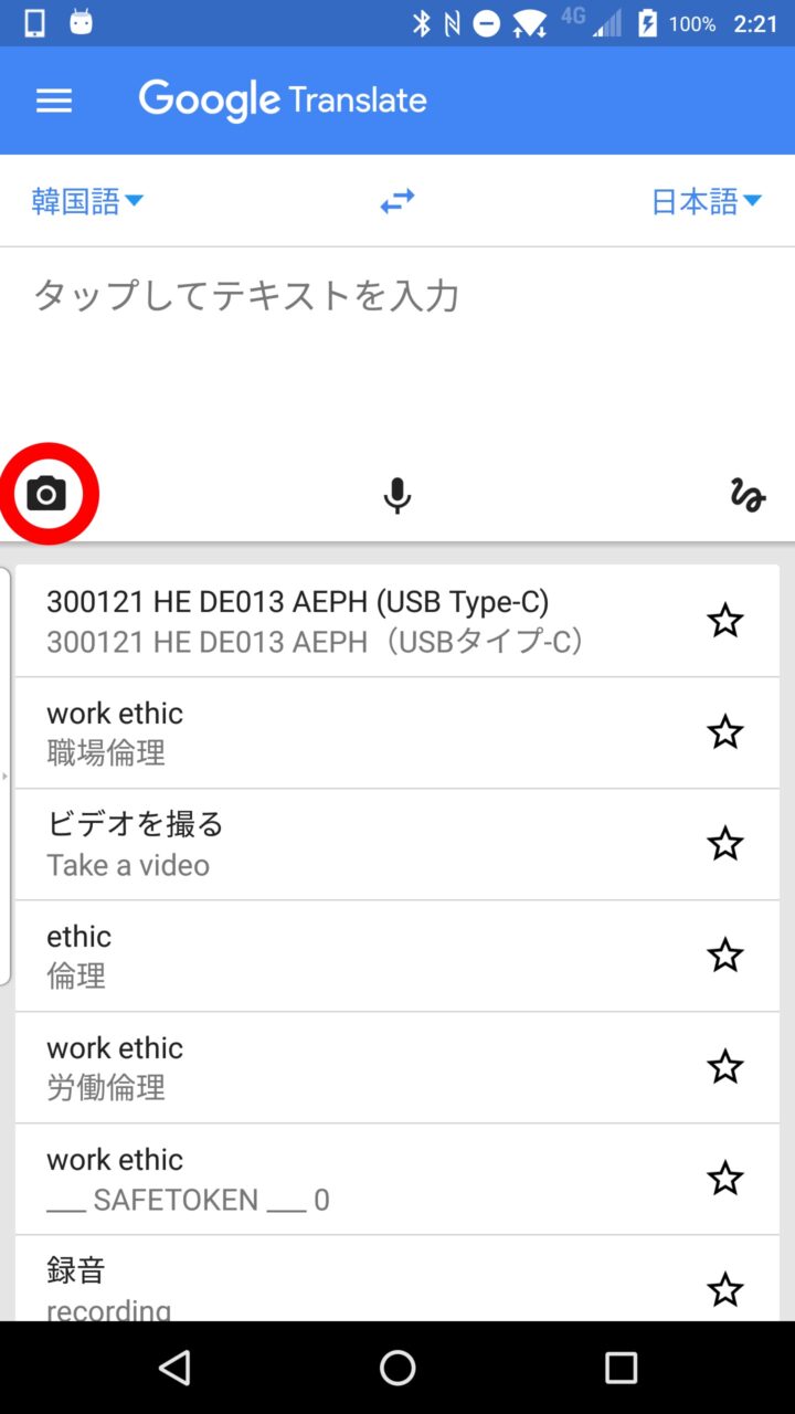 以前ご紹介させていただいたリアルタイム翻訳機能の “Word Lens” は、この “カメラモード” が進化した機能なのですが、2017 年 4 月末現在は日本語関連の翻訳では英語のリアルタイム翻訳にしか対応していません。しかし “カメラ”モード” は多くの言語をサポートしているので、英語以外の言語を日本語に翻訳する際に便利です。