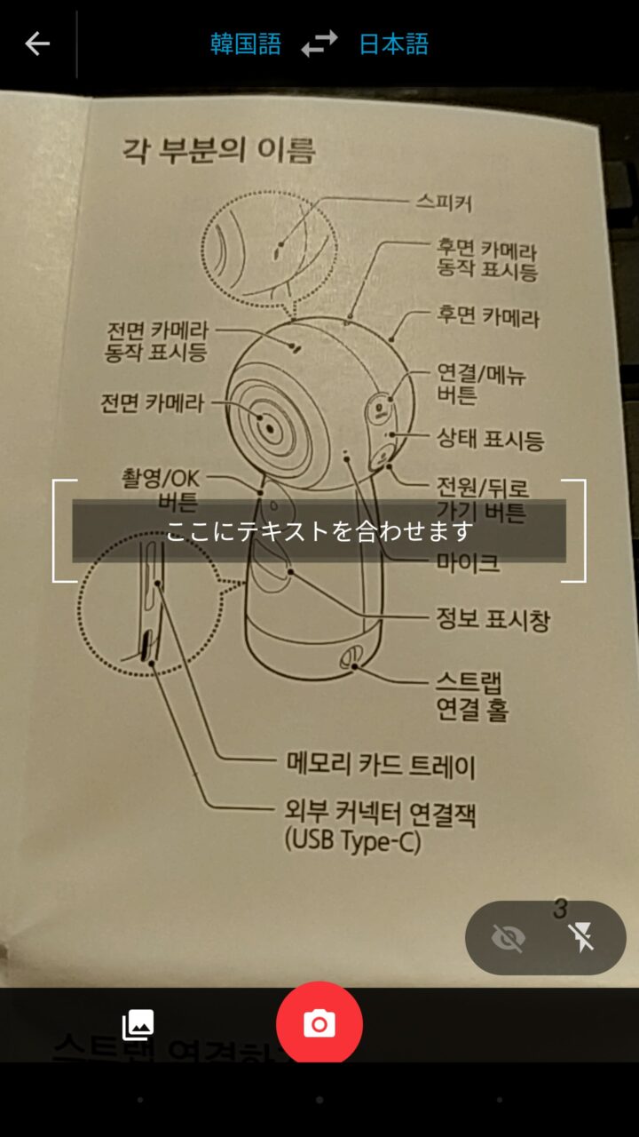 言語を設定したらカメラアイコンをタッチします。するとスマートフォンのリアカメラが起動するので、翻訳する元の言語が表示されている被写体にピントを合わせてシャッターアイコンをタッチします。