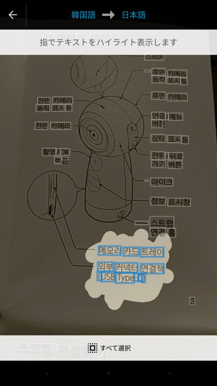 カメラ撮影が行われると被写体のテキストが自動で認識されます。更に翻訳する箇所を指でなぞることで、その部分の翻訳が行われます。テキストをすべて翻訳する場合は “すべて選択” をタッチします。“カメラモード” の使い方は以上です。