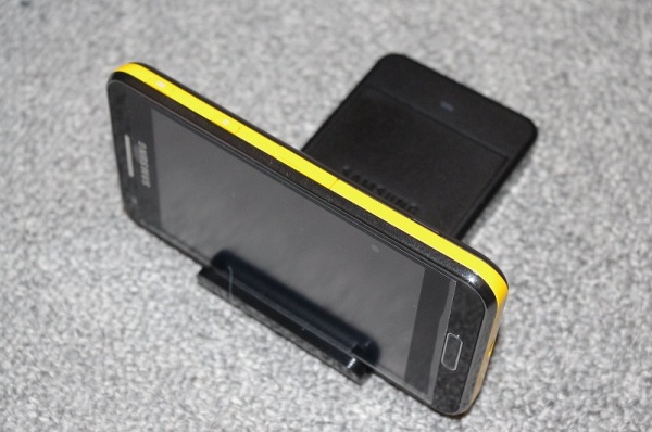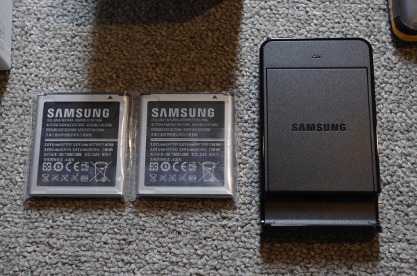 こんな感じで立てられて、Samsungロゴの蓋をあけると予備バッテリーを納められます。