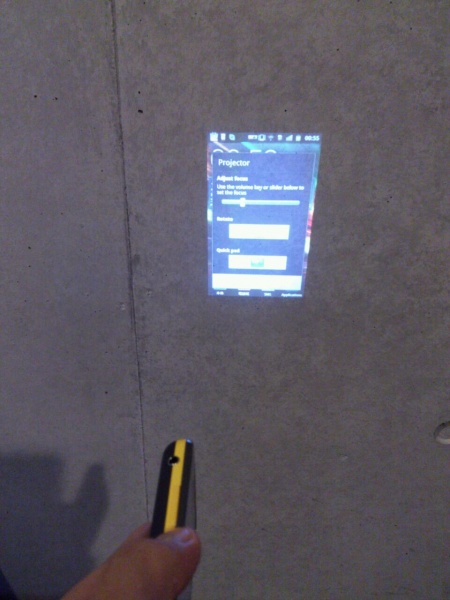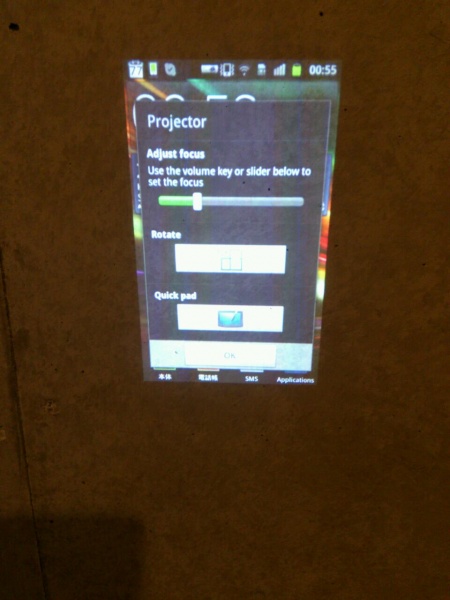 ちなみに投影している画面は投影の設定画面で、一番上のバー(Adjust fous)でフォーカスの調整をし、真ん中のトグルボタン(Rotate)で画面の向きを調整、一番下のトグルボタン(Quick pad)でカーソルボタンを表示させます。