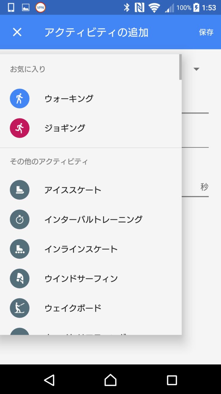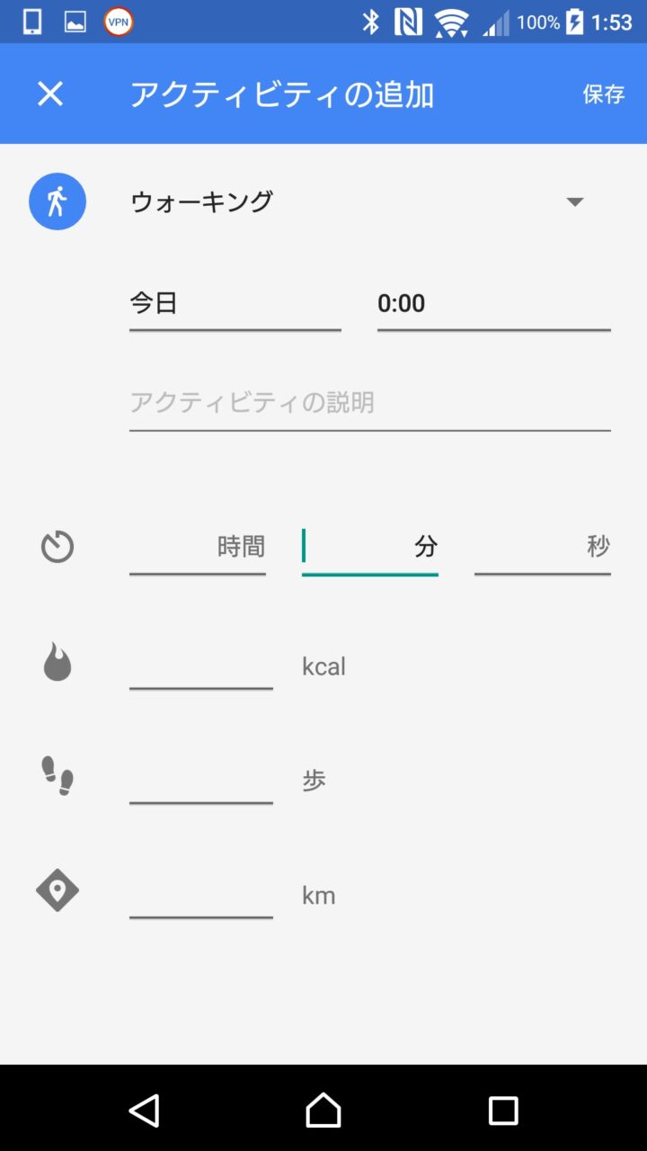 手動でのアクティビティの登録はまず、アクティビティタイプを選択し、アクティビティを行った時刻を設定します。次に時間、距離、消費カロリー、歩数のうち、時間のみか、時間とその他を入力して “保存” をタッチします。