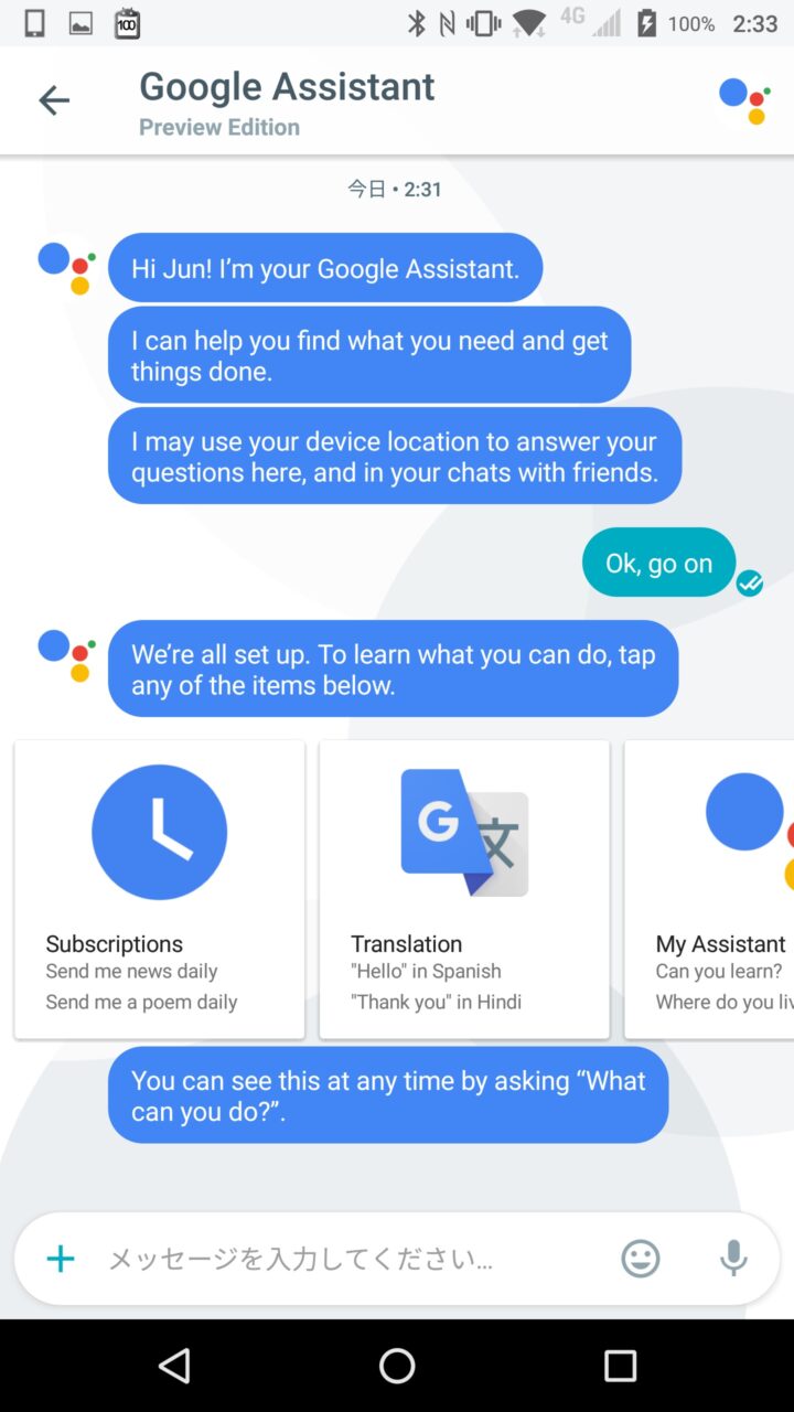 ただし「Google Assistant」は 2016 年 9 月末現在はプレビュー版となっていて、英語のみに対応しています。日本語の対応は 2016 年内に行われる予定です。