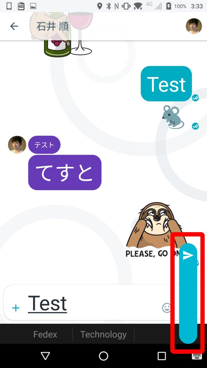 チャットではテキスト、絵文字、写真、動画、画像、ステッカー、現在地、音声メッセージを送信することができます。またテキストと絵文字は送信ボタンを長押しすることでサイズバーが表示され、上下スワイプでサイズを変更し、画面から離すことでそのサイズで送信することができます。