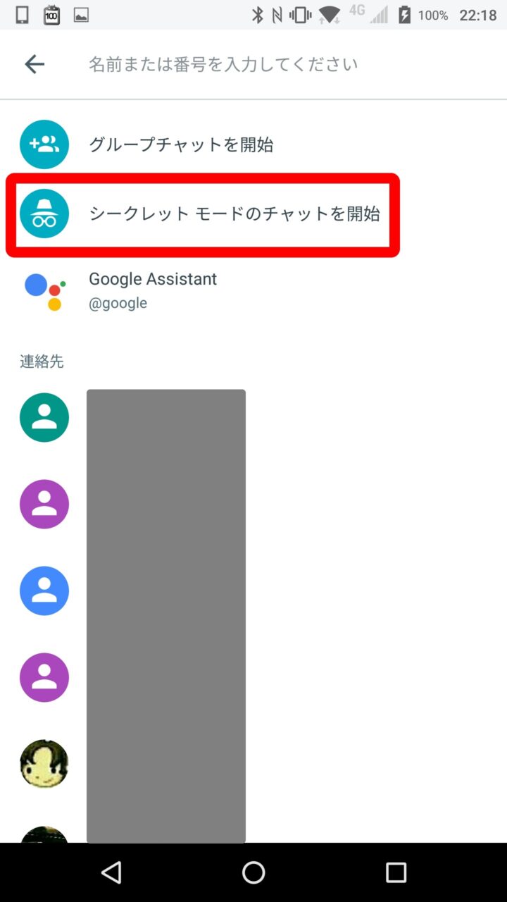 “シークレット モード” の使い方は簡単で、「Google Allo」ホーム画面右下の新規作成アイコンから “シークレット モードのチャットを開始” をタッチして、表示されるユーザーの中から 1 人を指定することでチャットが開始されます。