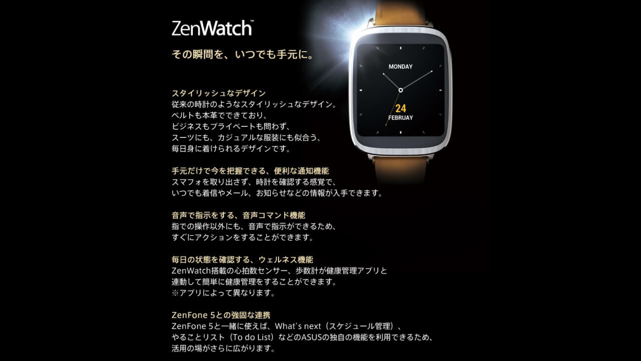 また ASUS の独自機能も搭載されているので、ZenPhone 5 とペアリングすることにより、スケジュール管理や To do リストなども活用可能です。