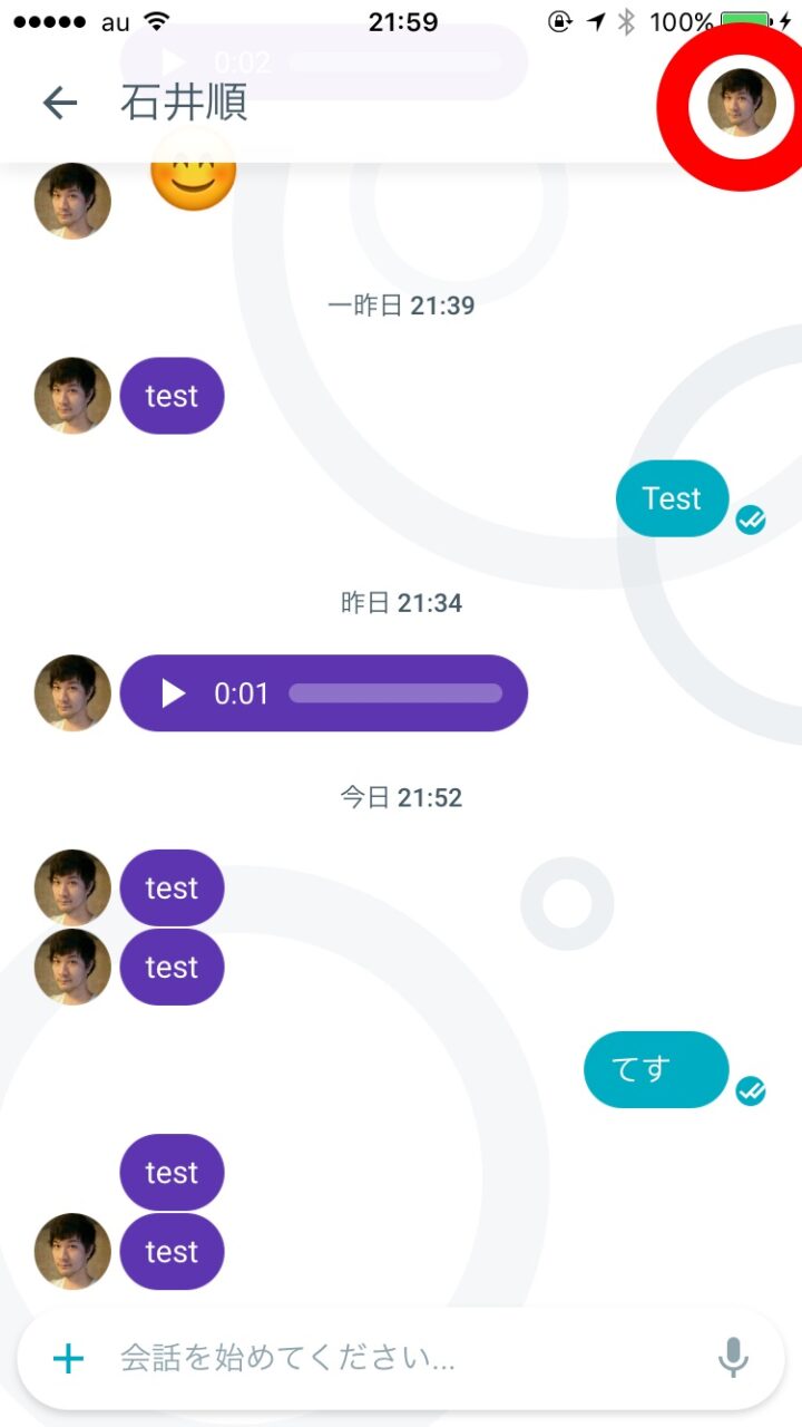 iPhone の場合は多少工程が異なります。削除するチャットを開き、右上のユーザーアイコンをタッチします。