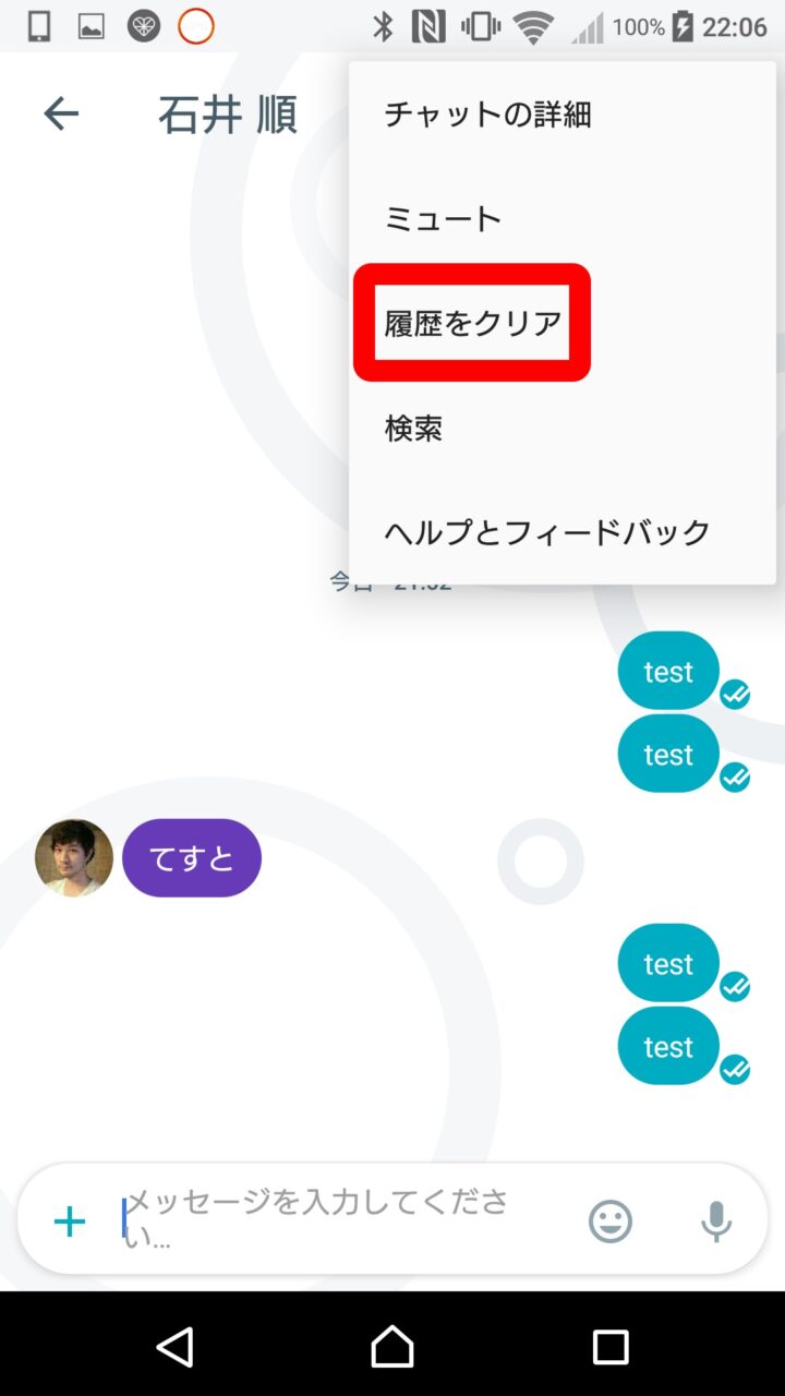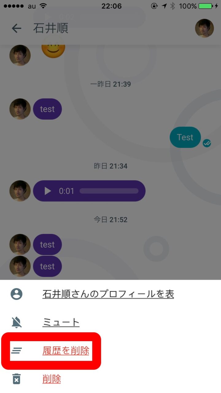 まず履歴を消去するチャットを開き、右上のユーザーアイコンをタッチします。表示される項目から、Android の場合は “履歴をクリア”、iPhone の場合は “履歴を削除” をタッチします。