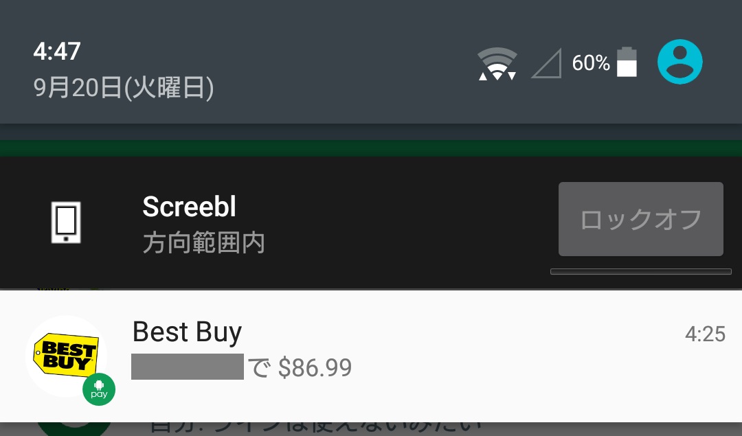 たったこれっだけで決済が完了します。決済が完了すると Android に通知が送られてきます。