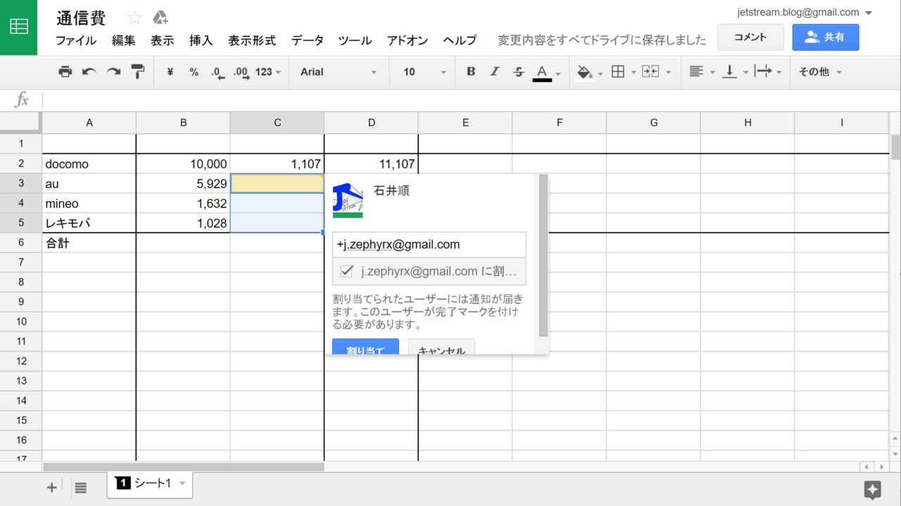 そして “コメント” の入力欄に、“+” と指定するユーザーの名前かメールアドレスを入力します。すると “割り当て” のチェックボックスが表示されるため、チェックを入れてコメントを投稿します。