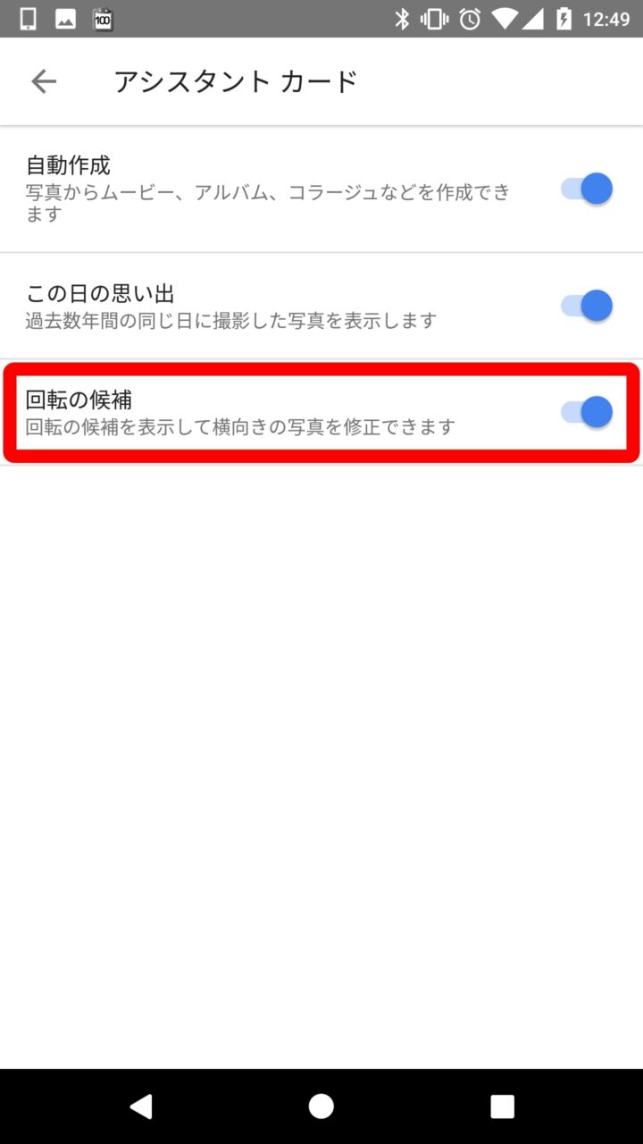 また “回転の候補” の設定項目はスマートフォンアプリでも “設定”、 “アシスタント カード” と進むことで表示されます。