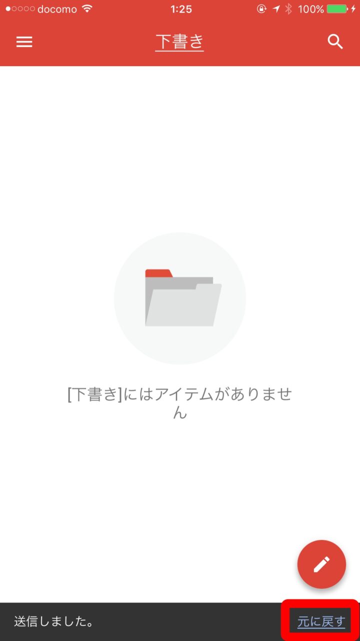 実際の取り消しは、メール送信後に画面下に一定時間表示される “キャンセル” もしくは “元に戻す” をタッチするだけです。