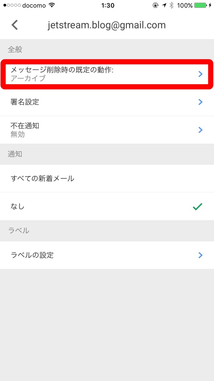 スワイプ時に “アーカイブ” にするか “削除” にするかは、“設定” の “メッセージ削除時の既定の動作” で指定することで変更可能です。