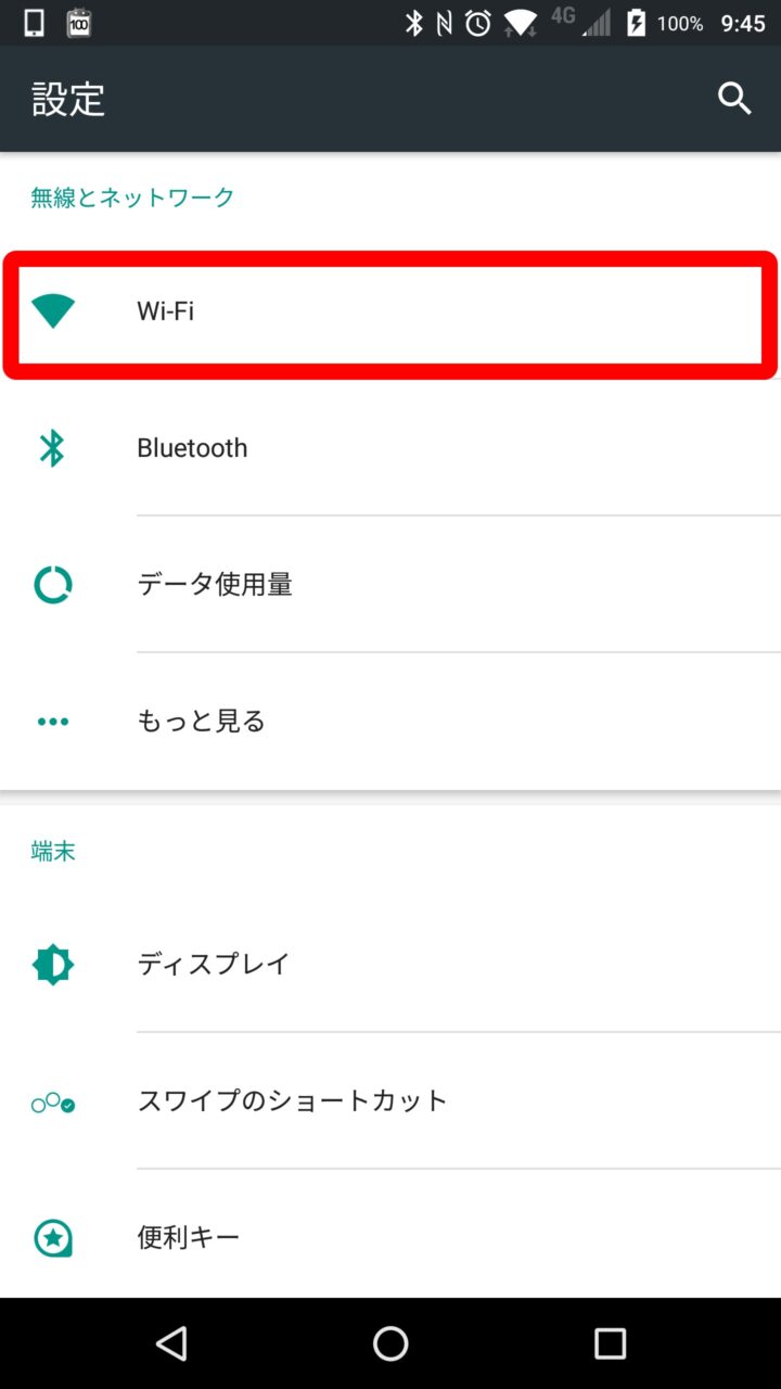 Android の WPS 接続項目は少しわかりにくい場所にあります。まず Android の設定などから “Wi-Fi” の設定を開きます。