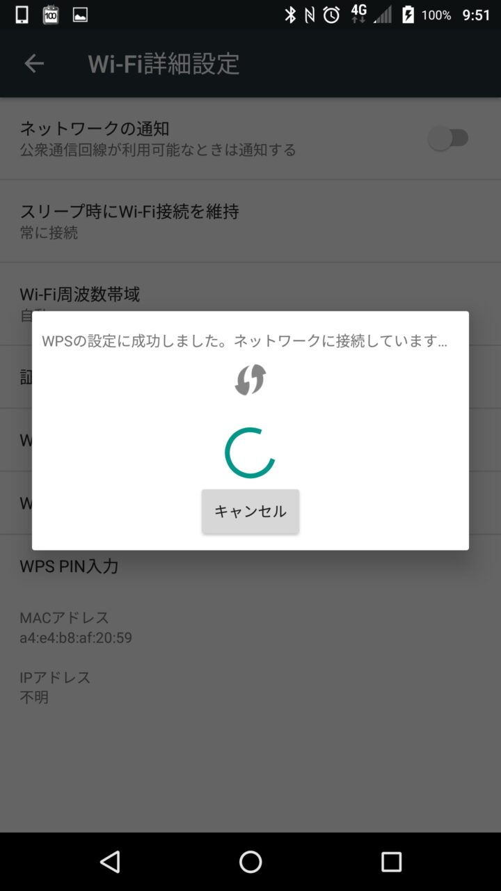 接続が開始され “WPS の設定に成功しました” と表示されれば完了です。以後 WPS で接続した Wi-Fi ルーターとは自動で接続されるようになるので、新たな操作は不要です。