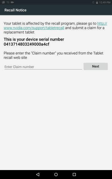 バッテリーの型番が「Y01」の場合はリコールの対象となるため、まずはこちらページにシリアルナンバーなどの必要事項を入力してクレームナンバーを取得し、「NVIDIA Shield Tablet」に配信される「Recall Notice」に取得済のクレームナンバーを入力して送信してください。