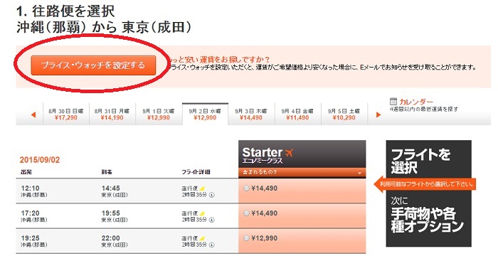 使い方は簡単で、まずは希望の路線の運賃を検索し、出てきた検索結果のページに表示される “プライス・ウォッチを設定する” から希望の運賃、メールアドレス、搭乗者数を入力して設定するのみ。
