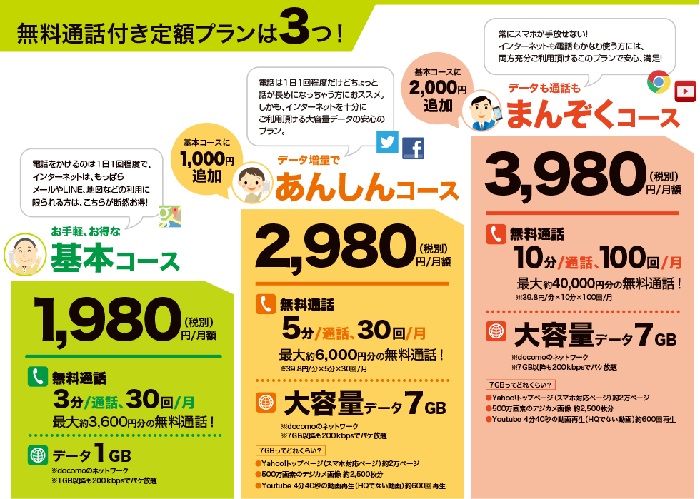 「かけたい放題」は完全な通話定額ブランではなく、3 分以内の通話を付きに 30 回以内 + データ通信 1GB(1,980 円)の「基本コース」、5 分以内の通話を付きに 30 回以内 + データ通信 7GB(2,980 円)の「あんしんコース」、10 分以内の通話を付きに 100 回以内 + データ通信 7GB(3,980 円)の「まんぞくコース」と、3 つのプランから選ぶ方式です。無料通話の範囲を超えた場合、1 分 / 39.8 円に跳ね上がります。