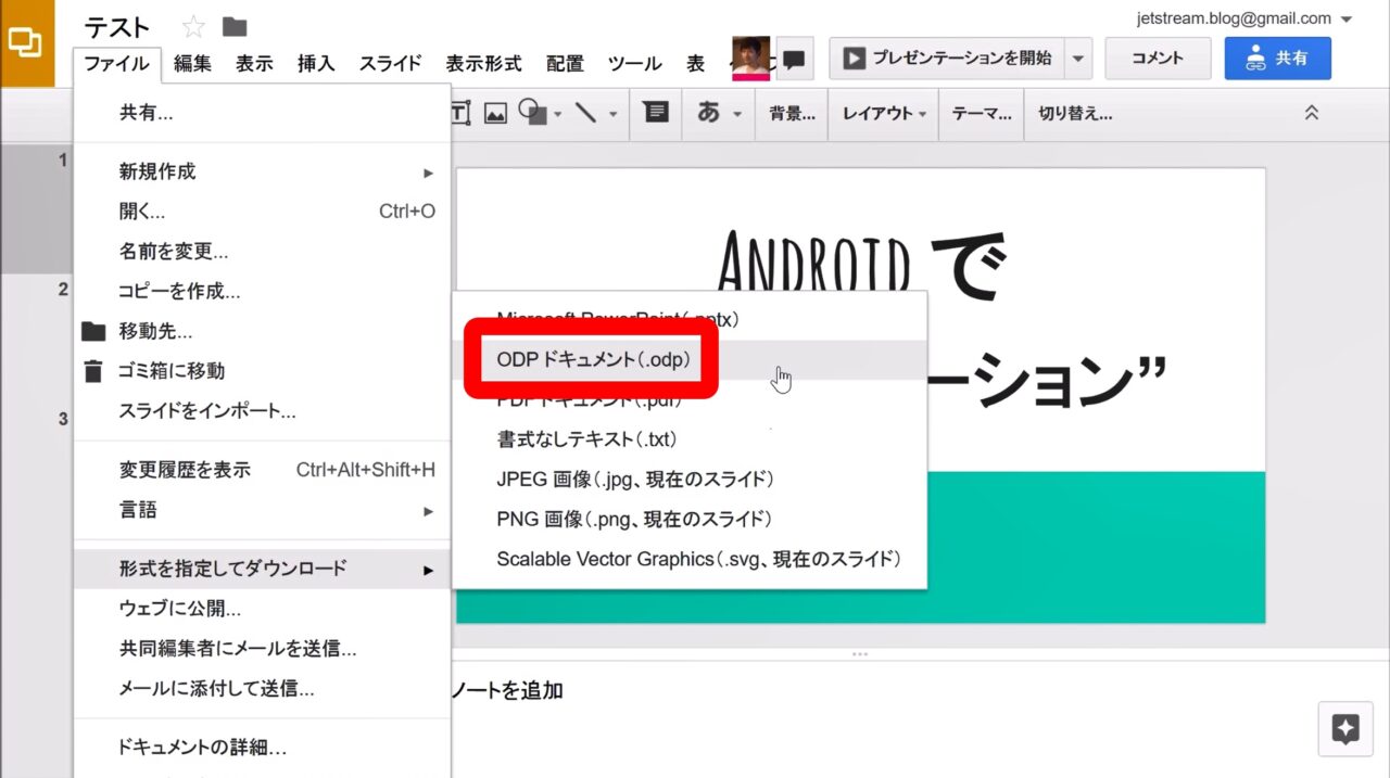 実際のエクスポートは、上部のメニューの “ファイル” から “形式を指定してダウンロード” をクリックして、“ODP ドキュメント” を選択するだけです。これまでと同じ操作でエクスポートを行うことができます。